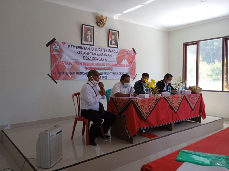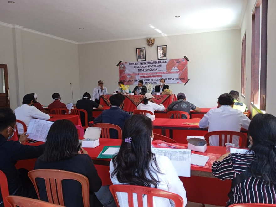 Pelaksanaan Musyawarah Perencanaan Pembangunan Desa ( MUSRENBANGDES ) di dalam situasi Bencana Non Alam ( COVID-19 ) dan diberlakukanya PPKM di wilayah Bali, maka dari itu Peserta Musrenbangdes Songan A dibatasi dan dengan tetap mematuhi Protokol Kesehatan Covid-19.